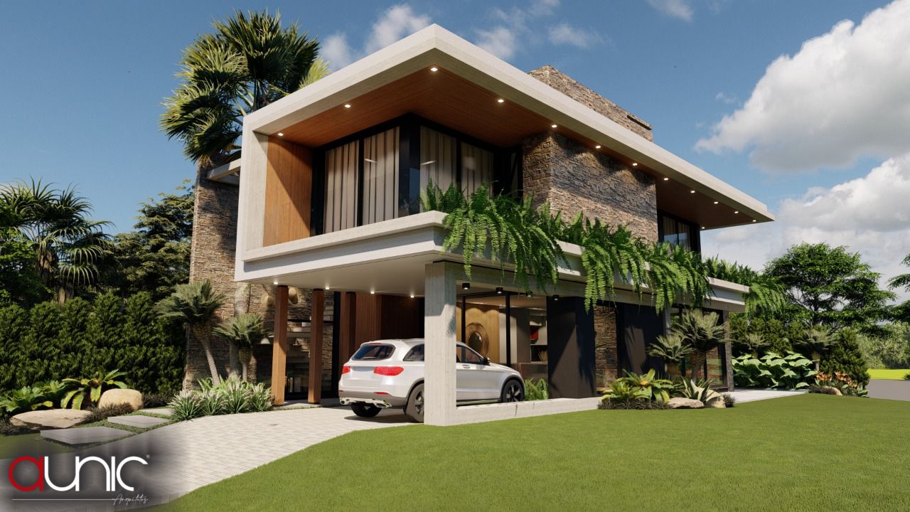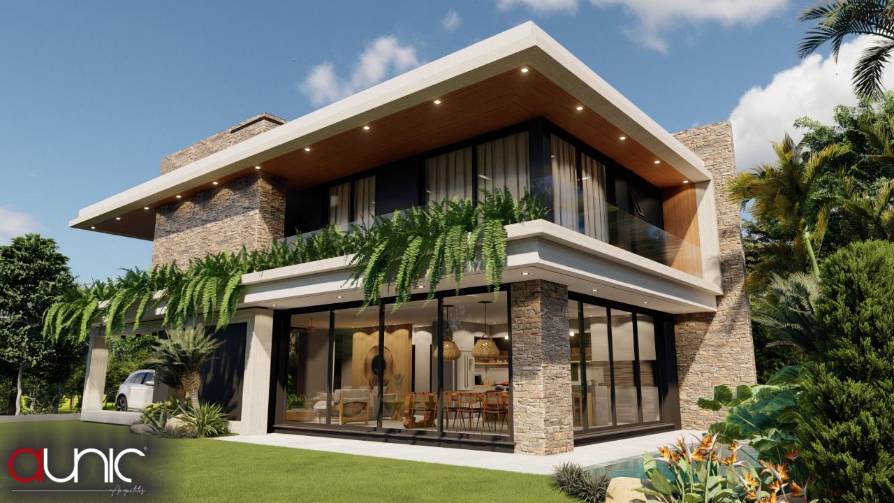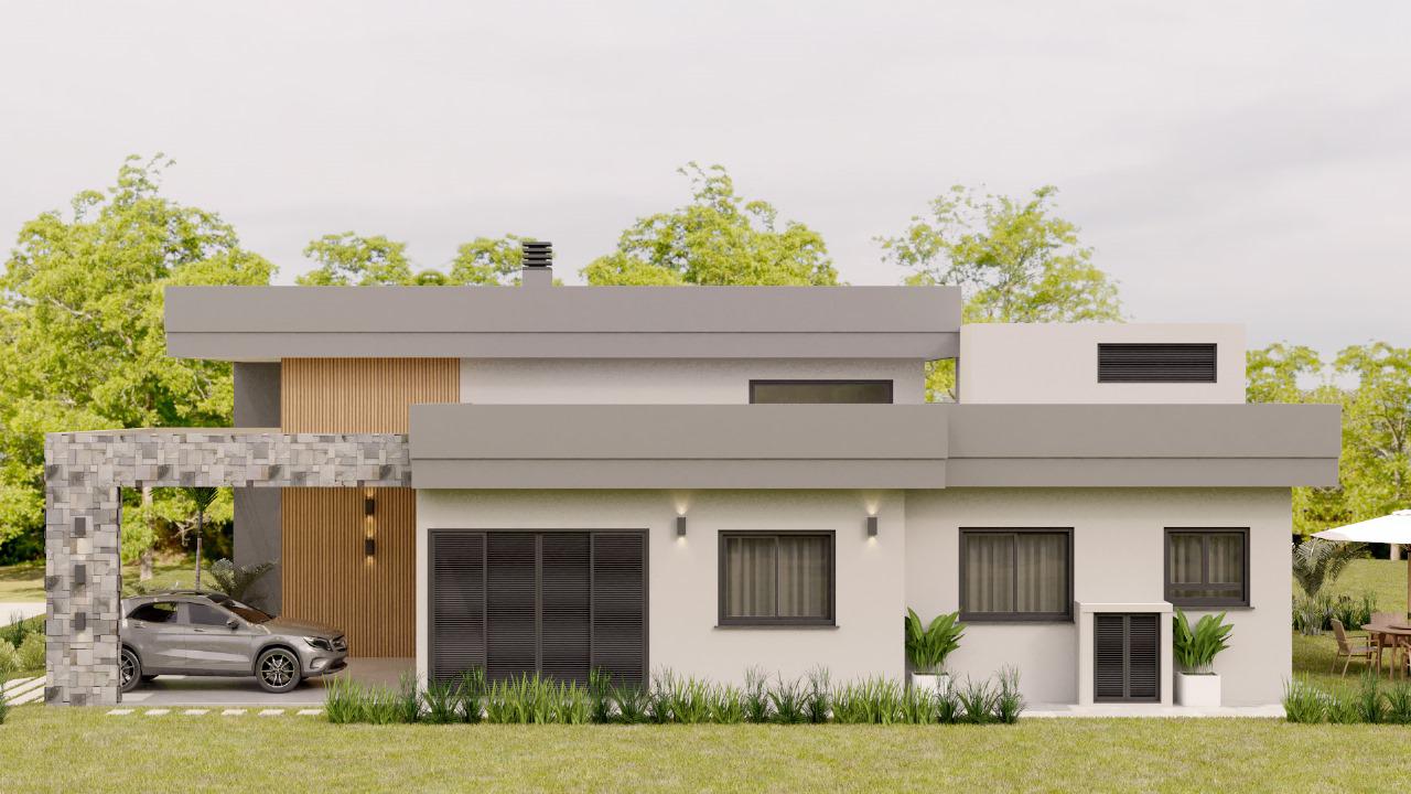 Projeto idealizado para um loteamento residencial. A edificação foi desenvolvida em dois pavimentos em concreto armado, com vigas em balanço de 1,5 m e escada autoportante, atendendo integralmente à proposta arquitetônica e garantindo modernidade, funcionalidade e segurança estrutural.